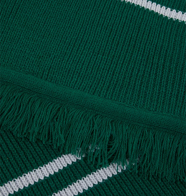 The scarf features the Slytherin colours of green and silver and is finished with green tassels. The scarf measures 200cm long and 30cm wide.