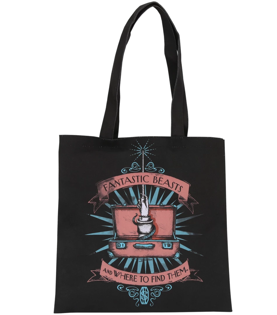 A black, cotton tote bag featuring a printed design detail of Newt Scamander’s suitcase and wand from Fantastic Beasts and Where to Find Them. The same pattern appears on both sides of the bag.