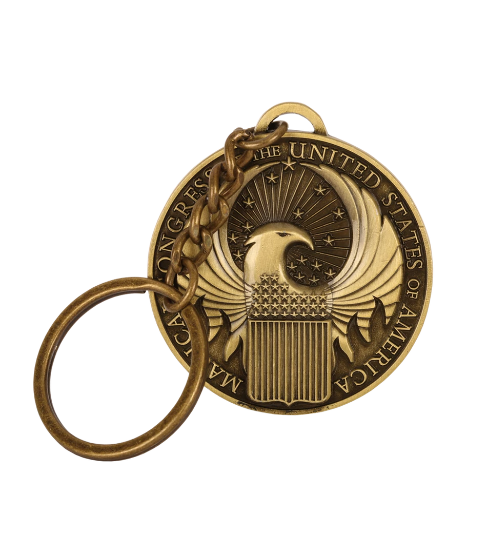An embossed keyring featuring The Magical Congress symbol, with the Fantastic Beasts and Where to Find Them logo on the reverse.