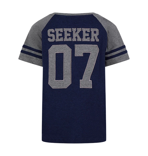 This kids Ravenclaw t-shirt features the Ravenclaw crest in traditional navy-blue house colours. The cosy t-shirt is made from 100% cotton and is complete with two blue stripes on each sleeve and a unique eagle design, the historic symbol of the Ravenclaw house. The word Seeker features on the reverse with its Quidditch position number in a light grey font.