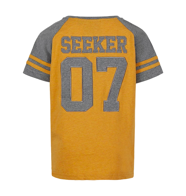 This brand new Kids Hufflepuff T-Shirt features the Hufflepuff crest in traditional bright yellow house colours. The cosy t-shirt is made from 100% cotton and is complete with two yellow stripes on each sleeve and a unique badger design, the historic symbol of the Hufflepuff house. The word Seeker features on the reverse with its Quidditch position number in a light grey font.
