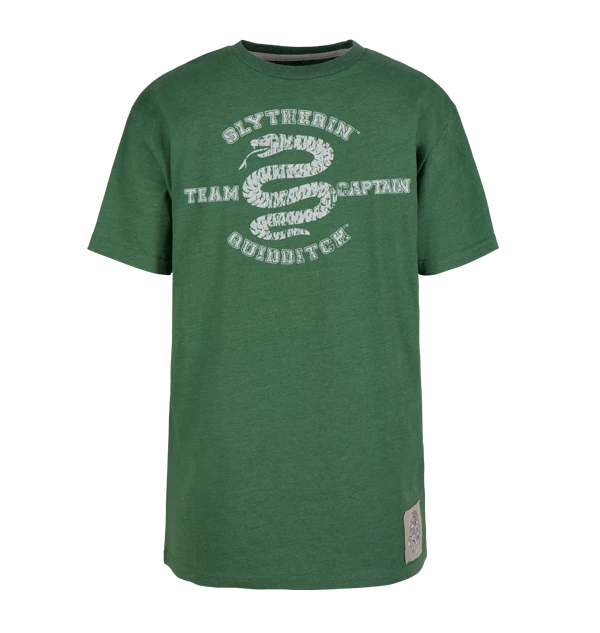 Join the Slytherin Quidditch team with this Kids Slytherin Quidditch Team Captain t-shirt. The t-shirt is a green colour, the traditional colour of the Slytherin house, and features a raised flock print design across the chest in grey of the Slytherin house animal, a snake.