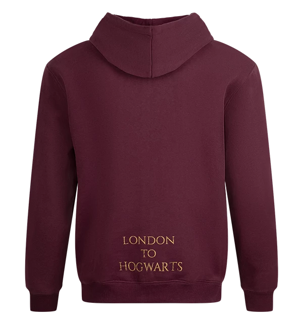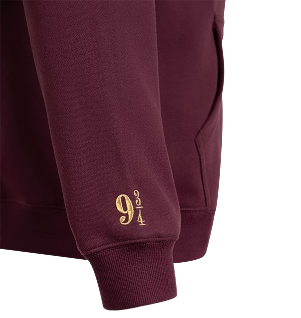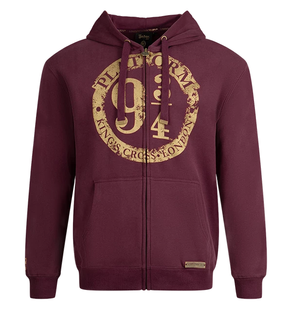 Wizardry school pride is made easy with this statement zipped hooded jumper. This unisex, burgundy Platform 9¾ Hoodie features a bespoke gold design of the Platform 9¾ logo in a unique distressed print. It includes front pockets to hide away your trinkets, or just to keep hands warm in the cooler months. This Platform 9¾ hoodie has a fitted hood and two burgundy strings which are adjustable for a suitable and comfortable fit. The perfect addition for any wizard or witch’s wardrobe.