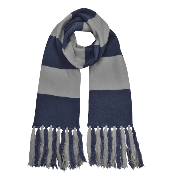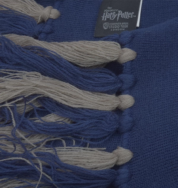 This scarf features the Ravenclaw house crest colours in a broad stripe pattern. It measures approximately 164cm long, and 21cm wide. The tassels add approximately 12cm extra to the end of the scarf.