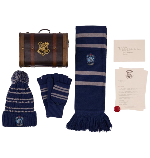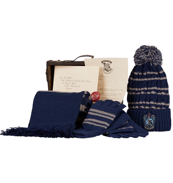 Take home this mini version of the Hogwarts School Trunk, crafted to resemble those used by Hogwarts students travelling on the Hogwarts Express. This bespoke Ravenclaw gift trunk features some exclusive items from our knitwear collection, as well as a Hogwarts Acceptance Letter, personalised with your own name and complete with an exclusive supplies list.