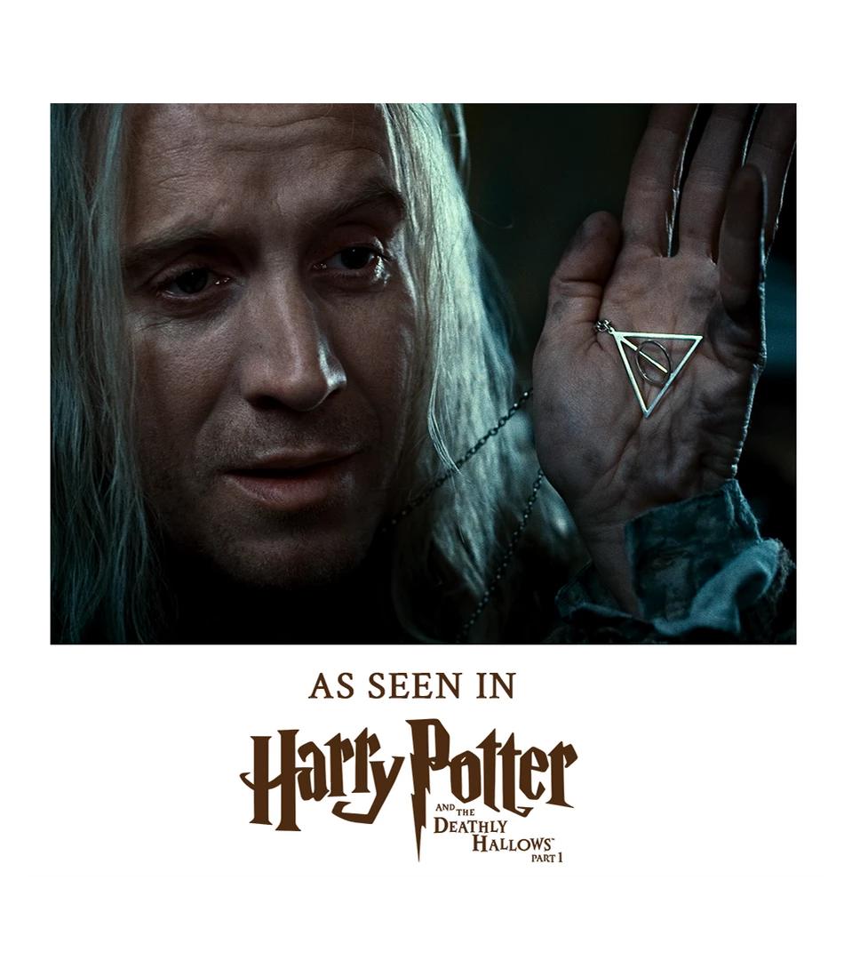 Add a little bit of magic to your jewellery collection with this bespoke replica of the one worn by Xenophilius Lovegood in Harry Potter and the Deathly Hallows Part 1. The silver-plated necklace features a rotating centre and represents the iconic Deathly Hallows, made up of the Elder Wand, Resurrection Stone and The Cloak of Invisibility.
